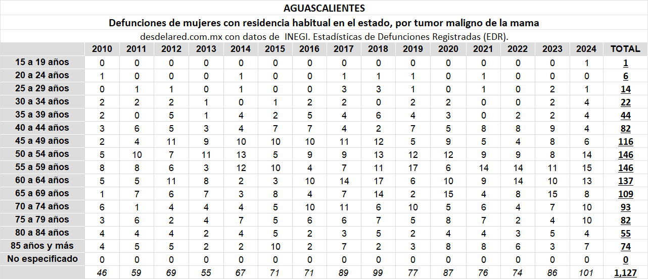 Desde el año de 2010 y hasta el 2024, por grupos quinquenales, estos son los fallecimientos por cáncer de mama en Aguascalientes